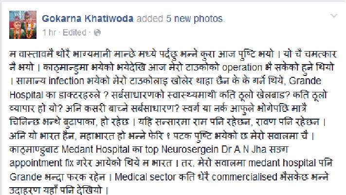 भयेको भयेदेखि आज मेरो टाउकोको operation भै सकेको हुने थियो । सामान्य infection भयेको मेरो टाउकोलाइ खोलेर थाहा छैन के के गर्ने थिये, Grande Hospital का डाक्टरहरुले ? सर्बसाधारणको स्वास्थ्यमाथी कति ठूलो खेलबाड? कति ठूलो व्यापार हो यो? अनि कसरी बाच्ने सर्बसाधारण? स्वर्ग या नर्क आफुले भोगेपछि मात्रै चिनिन्छ भन्थे बुढापाका, हो रहेछ । यहि सन्सारमा राम पनि रहेछन, रावण पनि रहेछन । अनि यो भारत हैन, महाभारत हो भन्ने फेरि १ पटक पुष्टि भयेको छ मेरो सवालमा चै । काठ्माण्डुबाट Medant Hospital का top Neurosergein Dr A N Jha सङग appointment fix गरेर आयेको थिये म भारत । तर, मेरो सवालमा medant hospital पनि Grande भन्दा फरक रहेन । Medical sector कति धेरै commercialised भैसकेछ भन्ने उदाहरण यहाँ पनि देखियो ।
