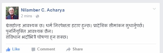 पहिलो संविधान सभाअन्तर्गतको संवैधानिक समितिका सभापति निलाम्बर आचार्यले नयाँ संविधानमा धर्म निरपेक्षता हटाउनुपर्ने धारणा व्यक्त गरेका छन् । आचार्यले आफ्नो फेसबुक भित्तामा आज विहान स्टाटस लेख्दै प्रादेशिक सिमांकन समेत सुधार्नु आवश्यक रहेको विचार व्यक्त गरेका हुन् ।