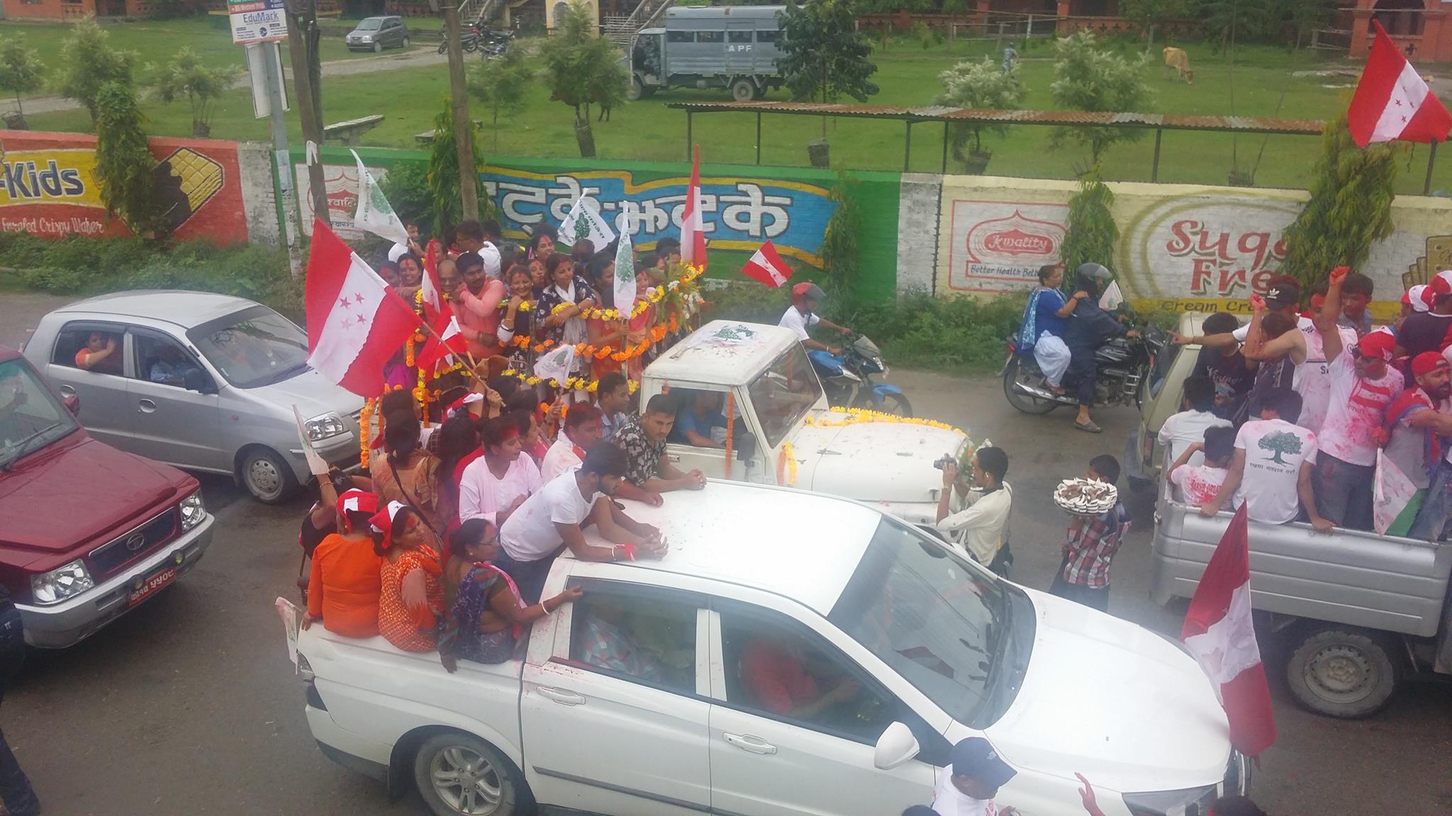 २५ असार, विराटनगर । विराटनगर महानगरपालिकामा नेपाली कांग्रेसले मेयर उपमेयरसहित ७ वटा वडामा विजय हासिल गरेपछि आज विजय र्याली निकालिएको छ । र्यालीमा कांग्रेस महामन्त्री सशांक कोइराला, केन्द्रीय नेता शेखर कोइरालालगायत स्थानीय नेता तथा कार्यकर्ता सहभागी भएका छन् । र्यालीले नगर परिक्रमा गरेको छ ।