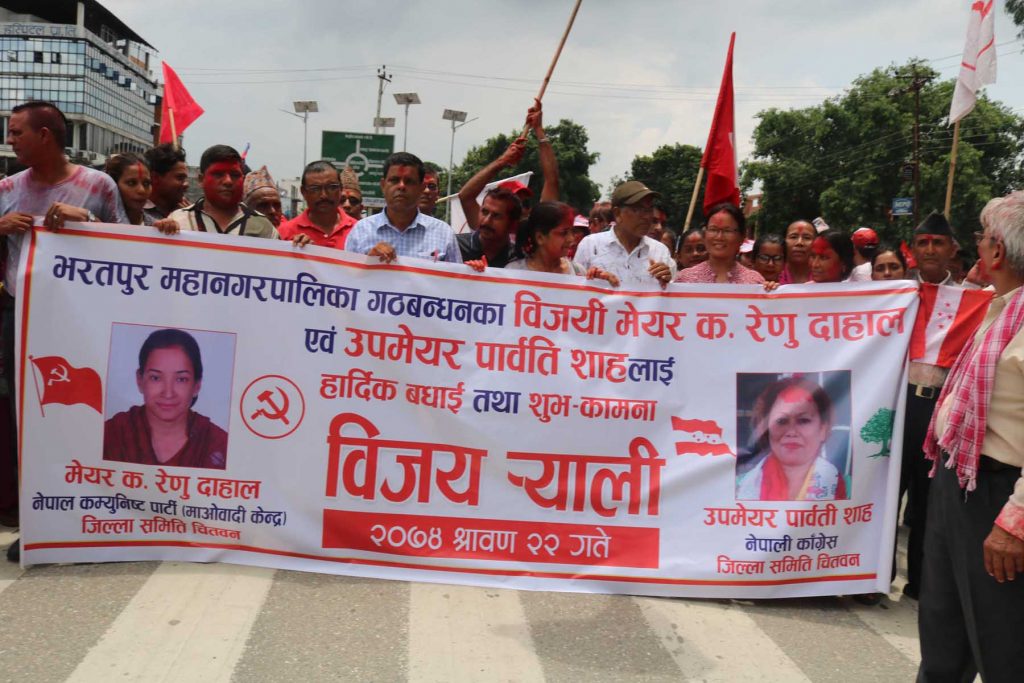 २२ साउन, चितवन । भरतपुरको प्रमुखमा रेणु दाहाल र उपप्रमुखमा पार्वती शाह निर्वाचित भएपछि नेपाली काँग्रेस र नेकपा माओवादी केन्द्र चितवनले संयुक्तरुपमा आइतबार विजय जुलुस निकालेका छन् ।