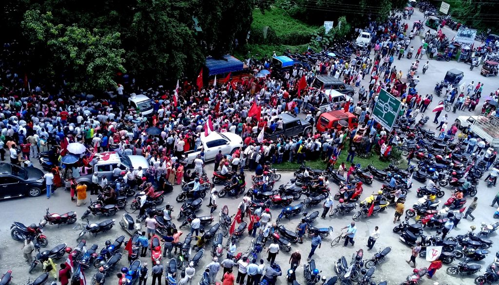 दुवै दलका झण्डाहरु मिश्रित जुलुश देखिन्छ । दाहाल र शाहलाई अविर लगाइदिनेको घुइँचो देखिन्छ ।