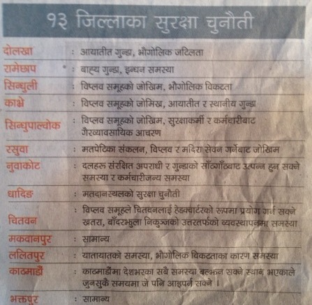 त्यस्तै धादिङ, चितवन, मकवानपुर, ललितपुर, काठमाडौं र भक्तपुर जिल्लामा पनि सुरक्षा चुनौती छ । तर, भक्तपुर र मकवानपुरमा भने सुरक्षा चुनौती सामान्य रहेको अन्नपूर्णपोस्टमा समाचार छ । सो समाचारमा जनाइएअनुसार निम्न जिल्लाहरुमा निम्न खालको सुरक्षा चुनौति देखिएको छ :